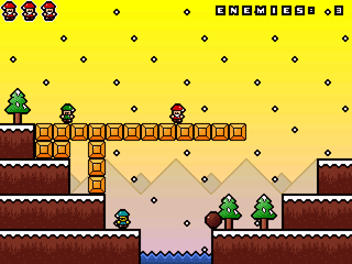 What you have is a 16-level platformer in which you control Santa. He must kill all the enemies in each level by jumping on their heads. If Santa gets hurt, he loses one of his three lives, but never fear!